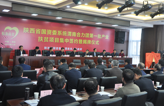 11月23日上午,渭南合力團第一批產業扶貧項目集中簽約暨渭南合力產業扶貧有限公司揭牌儀式在渭南市財富中心舉行。省政府副省長馮新柱,省國資委主任胡保存,省政府研究室副主任孫守平,省扶貧辦副主任彭安季,省國資委黨委副書記郁偉及省政府有關部門領導;渭南市市委副書記、市長李明遠,渭南市副市長王心及渭南市委、市政府有關部門領導;渭南合力團各成員單位、相關企業、新聞媒體共計100多人參加了簽約暨揭牌儀式。集團公司副總經理郭岐鎖及相關工作人員參加。