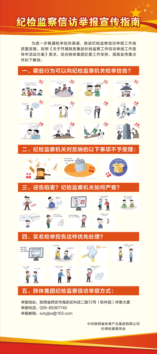 陜體集團紀委按照陜旅集團紀委《關于開展陜旅集團紀檢監察工作信訪舉報工作宣傳年活動方案》的要求,印發了集團系統信訪舉報工作宣傳年活動的通知,進一步明確了工作要求、宣傳重點和信息報送等內容。集團紀委制定了紀檢監察信訪舉報宣傳指南,明確“紀檢監察機關處理檢舉控告受理范圍”“紀檢監察機關處理檢舉控告不受理范圍”“實名檢舉控告優先辦理”“誣告陷害,紀檢監察機關如何嚴查”等內容,同時在集團官網、官微等多個平臺公布了向集團公司紀檢監察機關進行信訪舉報的方式,引導鼓勵廣大員工從“要舉報”向“會舉報”轉變。