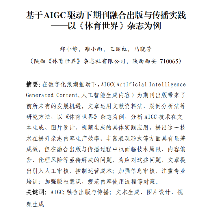 會議期間,《體育世界》編輯部團(tuán)隊撰寫的論文《基于AIGC驅(qū)動下學(xué)術(shù)期刊數(shù)字化生產(chǎn)與新媒體融合出版實踐——以〈體育世界〉雜志為例》榮獲“優(yōu)秀論文獎”。該獎項不僅是對我刊編輯團(tuán)隊工作的充分肯定,同時也是雜志社踐行出版學(xué)者化理念、打造研究型編輯隊伍的有力實踐。未來,我們將以此為契機(jī),加強(qiáng)編輯業(yè)務(wù)研究,將榮譽(yù)轉(zhuǎn)化為推動期刊高質(zhì)量發(fā)展的智慧動能。