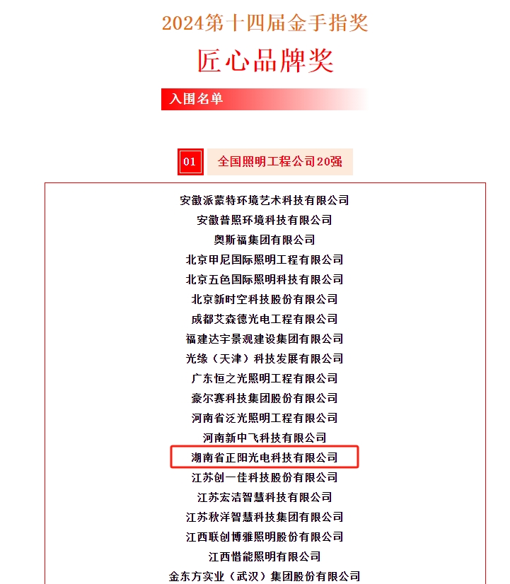 中國(guó)照明行業(yè)2024第十四屆金手指獎(jiǎng)全國(guó)評(píng)選大賽圓滿結(jié)束,湖南省正陽(yáng)光電科技有限公司被評(píng)為匠心品牌獎(jiǎng)“全國(guó)照明工程公司20強(qiáng)”。
