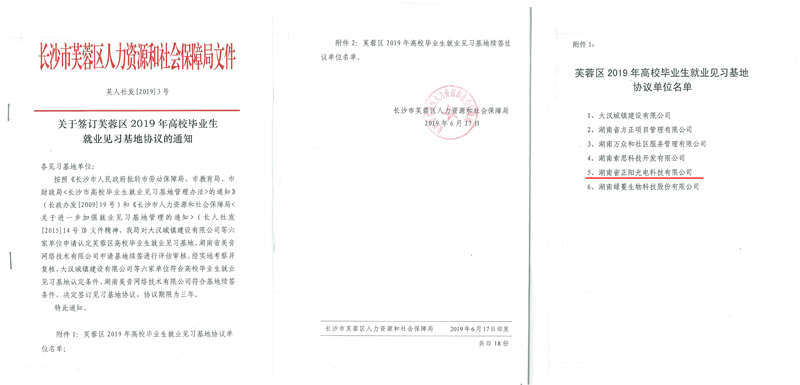 2019年6月17日,長沙市芙蓉區(qū)人力資源和社會(huì)保障局下發(fā)紅頭文件“芙人社發(fā)[2019]3號(hào)”,僅六家芙蓉區(qū)單位成為高校畢業(yè)生就業(yè)見習(xí)基地,湖南正陽為其中一家,并與我司簽...