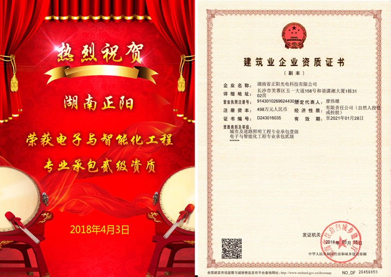 2018年4月3日,經(jīng)湖南省住房和城鄉(xiāng)建設(shè)廳批準(zhǔn),湖南正陽獲得“電子與智能化工程專業(yè)承包貳級(jí)資質(zhì)”證書。