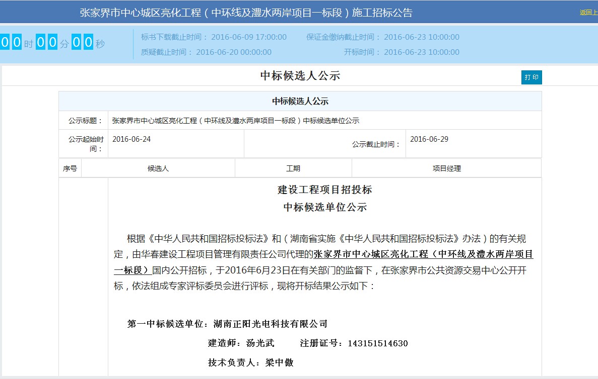 2016年6月24日,湖南省正陽(yáng)光電科技有限公司成功中標(biāo)張家界市中心城區(qū)亮化工程(中環(huán)線及澧水兩岸項(xiàng)目一標(biāo)段)。