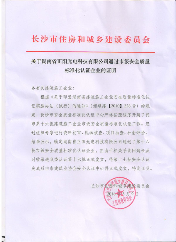 熱烈祝賀湖南省正陽光電科技有限公司通過市級安全質(zhì)量標(biāo)準(zhǔn)化認(rèn)證企業(yè)!