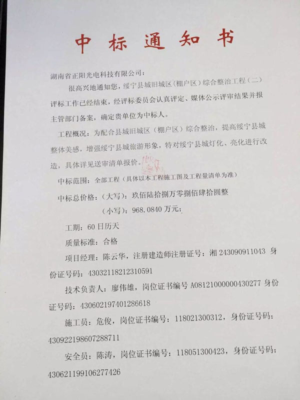 熱烈祝賀湖南正陽成功簽約綏寧縣城舊城區(qū)(棚戶區(qū))綜合整治工程亮化工程(二)施工項目!