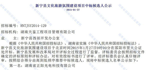 2015年1月27日,我公司成功中標(biāo)新寧縣文化旅游氛圍建設(shè)項(xiàng)目,熱烈祝賀祝湖南正陽(yáng)成功中標(biāo)新寧縣文化旅游氛圍建設(shè)項(xiàng)目!